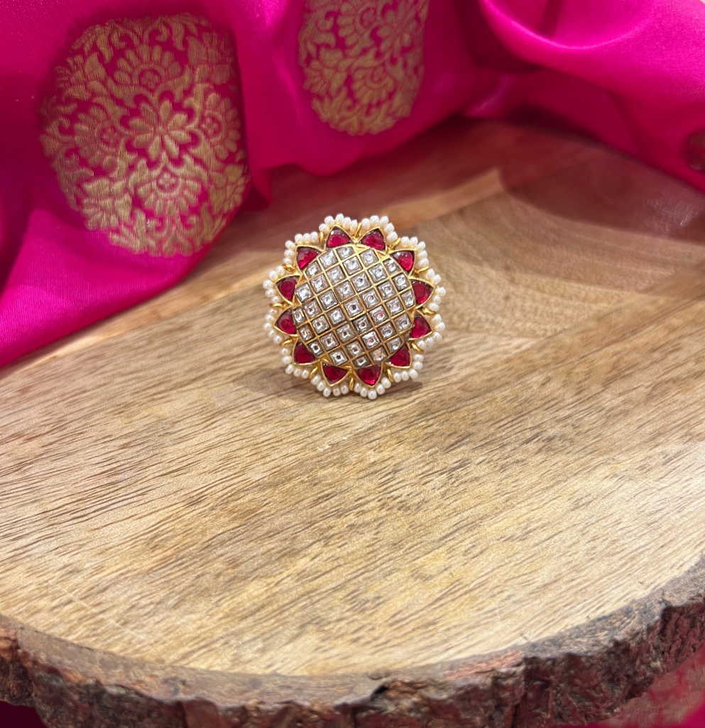 Elevate your jewelry game with this striking adjustable Kundan ring, adorned with pink and white Kundan stones and finished with natural pearls for a touch of classic opulence. Meticulously crafted from 92.5 sterling silver and coated in 22kt gold plating, this piece effortlessly blends luxury with traditional Indian aesthetics.