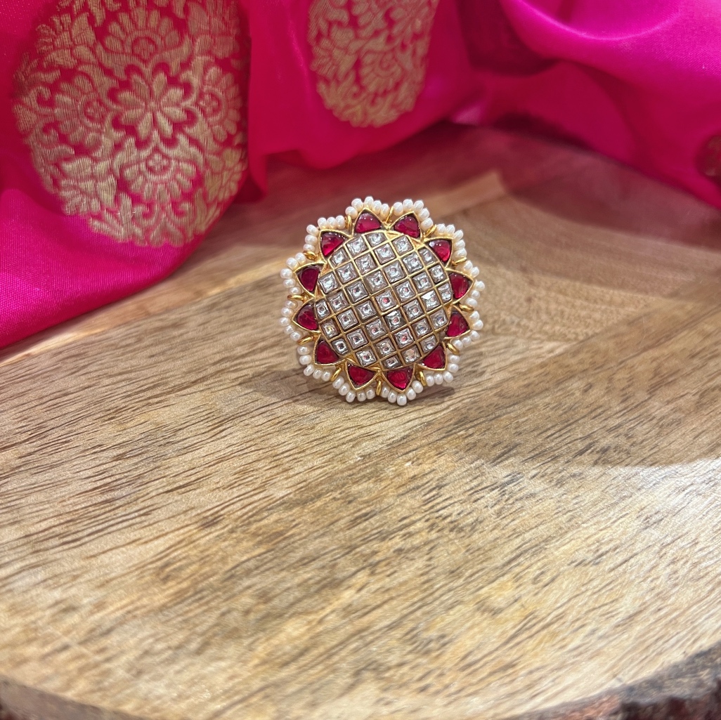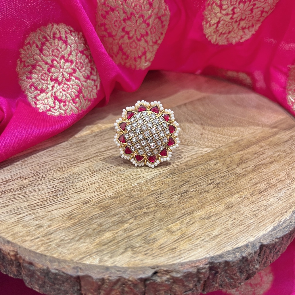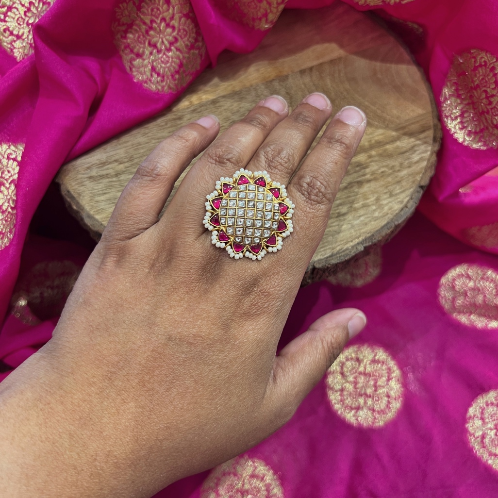 Statement adjustable ring with pink & white kundan stones and natural pearls. Crafted in 92.5 silver with 22kt gold plating. Centerpiece: 1.4 inches. Ships in 48–72 hours.