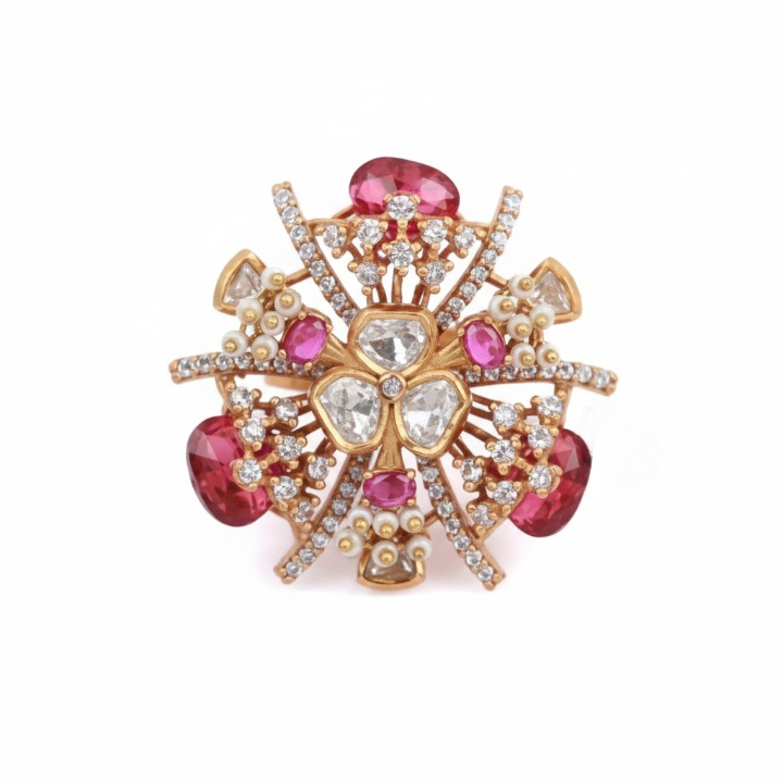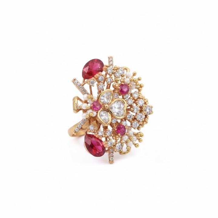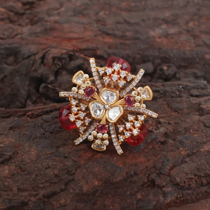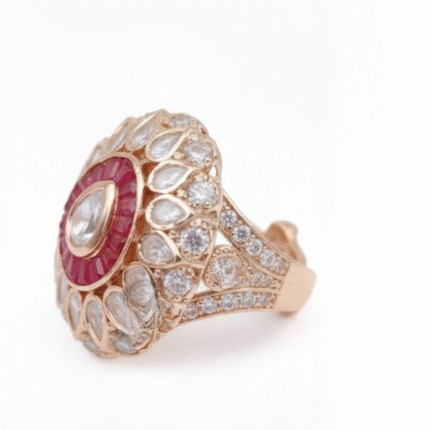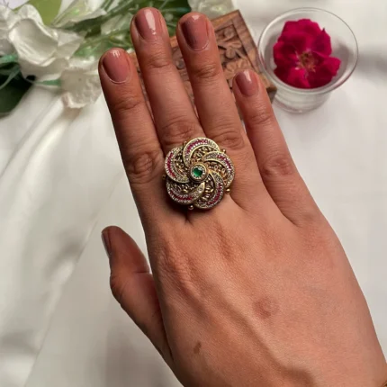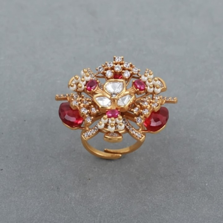 Measuring 2.8 cm x 3.6 cm and weighing 11 g, it provides a comfortable fit while making a bold style statement. Its adjustable size ensures versatility across most finger sizes. Ideal for weddings, parties, festive occasions, or gifting, this ring complements both traditional and fusion ethnic outfits.