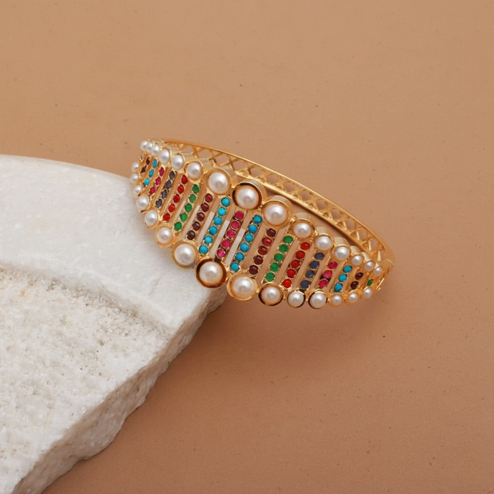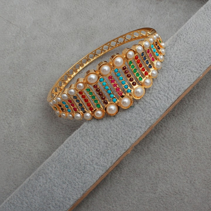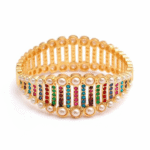 Add a touch of elegance to your jewelry collection with this Gold Jadau Bracelet, crafted from premium silver and plated with lustrous gold. Featuring Jadau and stones with a finely embellished finish, this bracelet is perfect for festive occasions, weddings, or gifting.