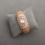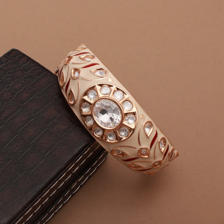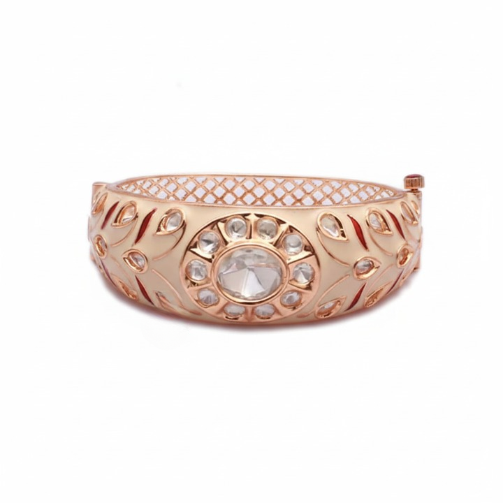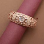 Elevate your jewelry collection with this Gold Kundan Bracelet, crafted from premium silver and plated with lustrous gold for a rich, timeless shine. The bracelet is adorned with Kundan and stones, featuring an intricately embellished design that adds a touch of sophistication to any outfit.