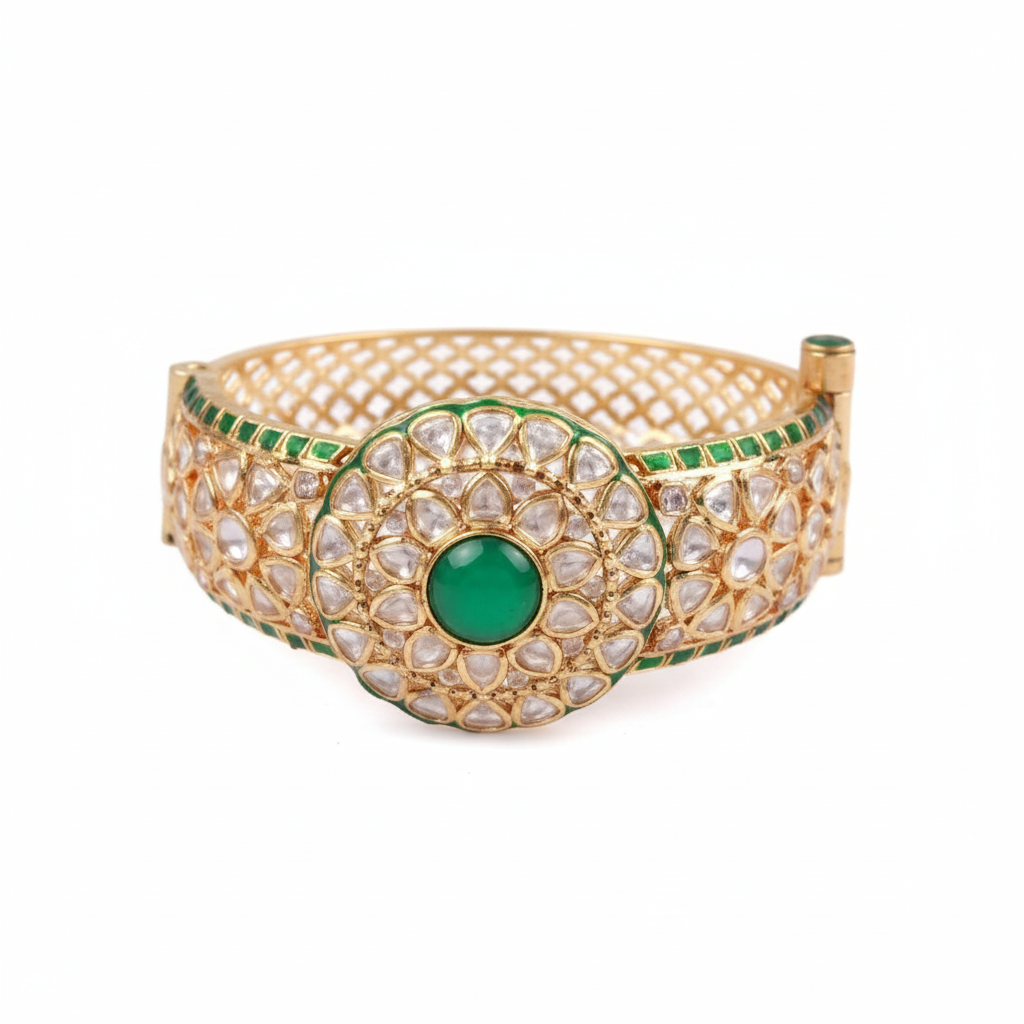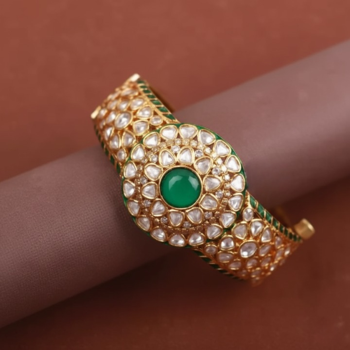 Elegant gold plated Kundan bracelet, crafted from silver. Embellished design, size 2.4 with secure lock – perfect for weddings, parties & festive wear.