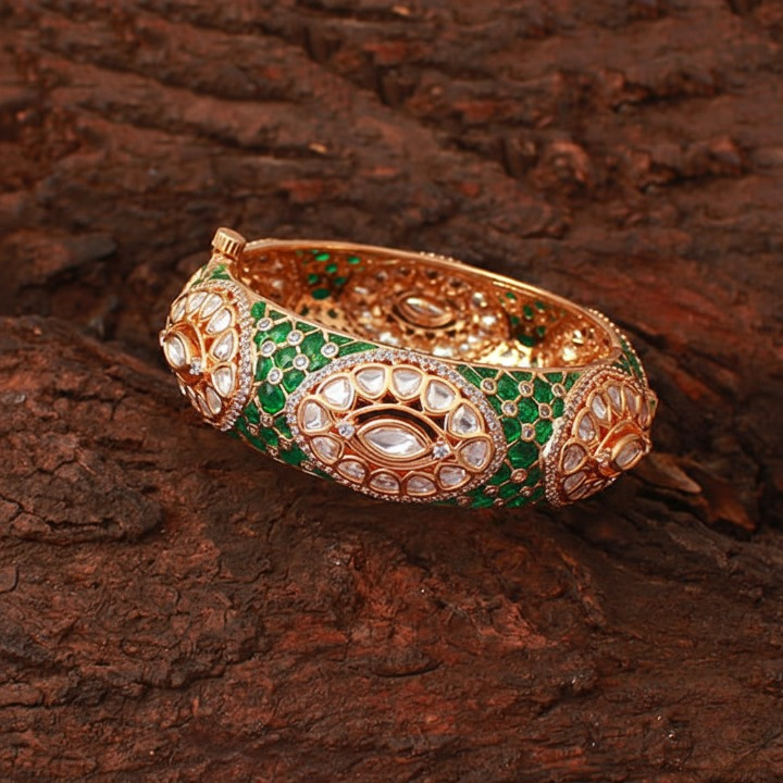 Elevate your traditional jewelry collection with this Gold-Plated Kundan Bracelet. Crafted from high-quality silver and plated with premium gold, this bracelet is beautifully adorned with Kundan and  stones, giving it a rich, embellished finish.