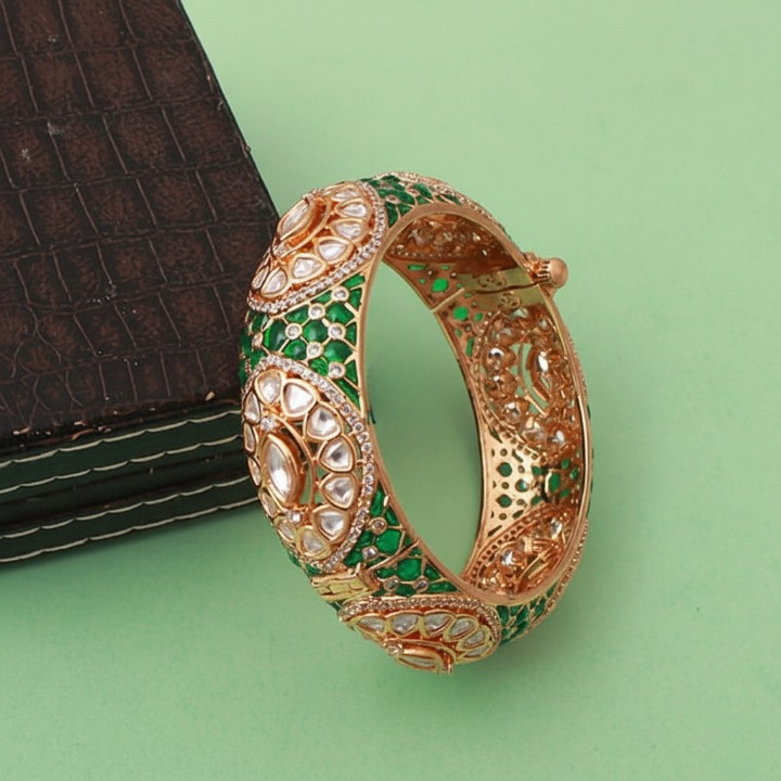 Gold-plated Kundan bracelet, 7 cm length, 1.9 cm width, 48g. Embellished design with secure lock, perfect for weddings, festivals, and ethnic occasions. Slight color/dimension variations may occur.