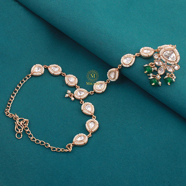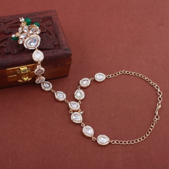 Bring traditional elegance to your festive and bridal looks with this stunning Gold-Plated Kundan Hathphool. Expertly crafted from a silver and finished with luxurious gold plating, this embellished hand harness radiates grace and sophistication.