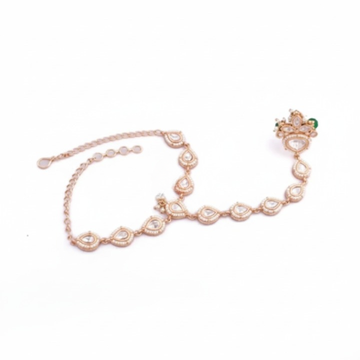 Designed with intricate detailing, it is adorned with  making it a statement piece for weddings, festive occasions, and cultural celebrations. The free-size bracelet with an adjustable chain and adjustable ring ensures comfort and versatility, fitting beautifully on any hand.