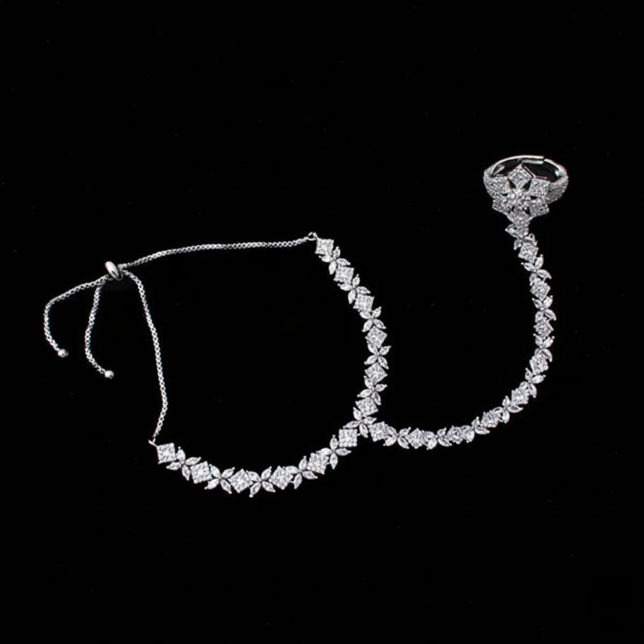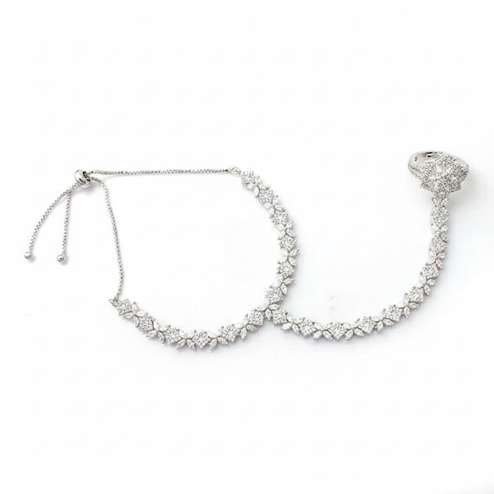 This hand-harness style accessory includes a bracelet with an attached adjustable ring, combining style and comfort. Both fully adjustable for a perfect fit. It is lightweight yet striking—ideal for weddings, festivals, and cultural celebrations.
