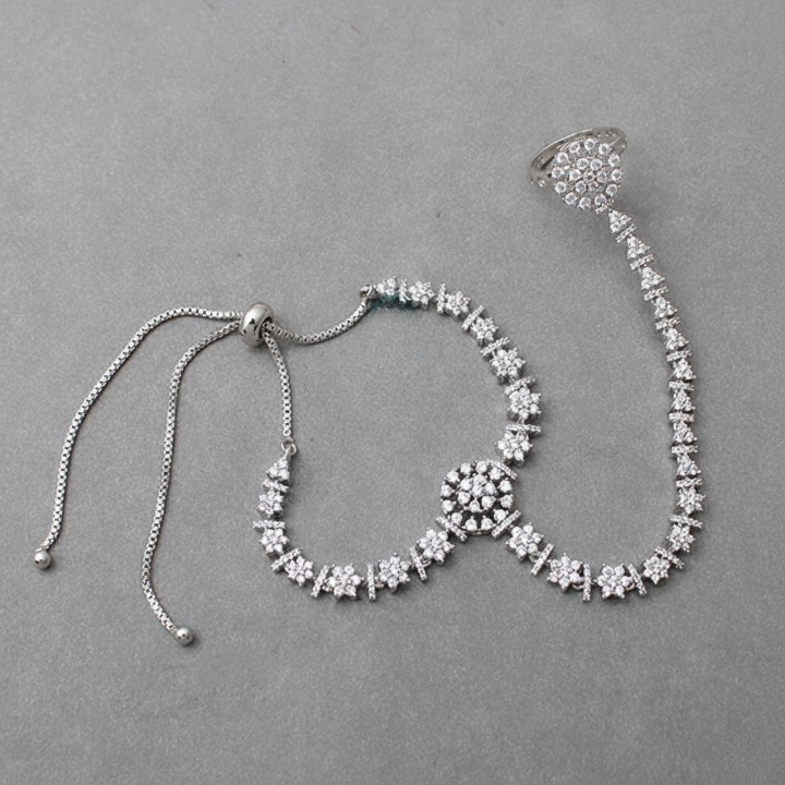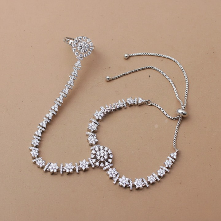 Rhodium/Gold Plated CZ Hathphool Bracelet with Adjustable Ring