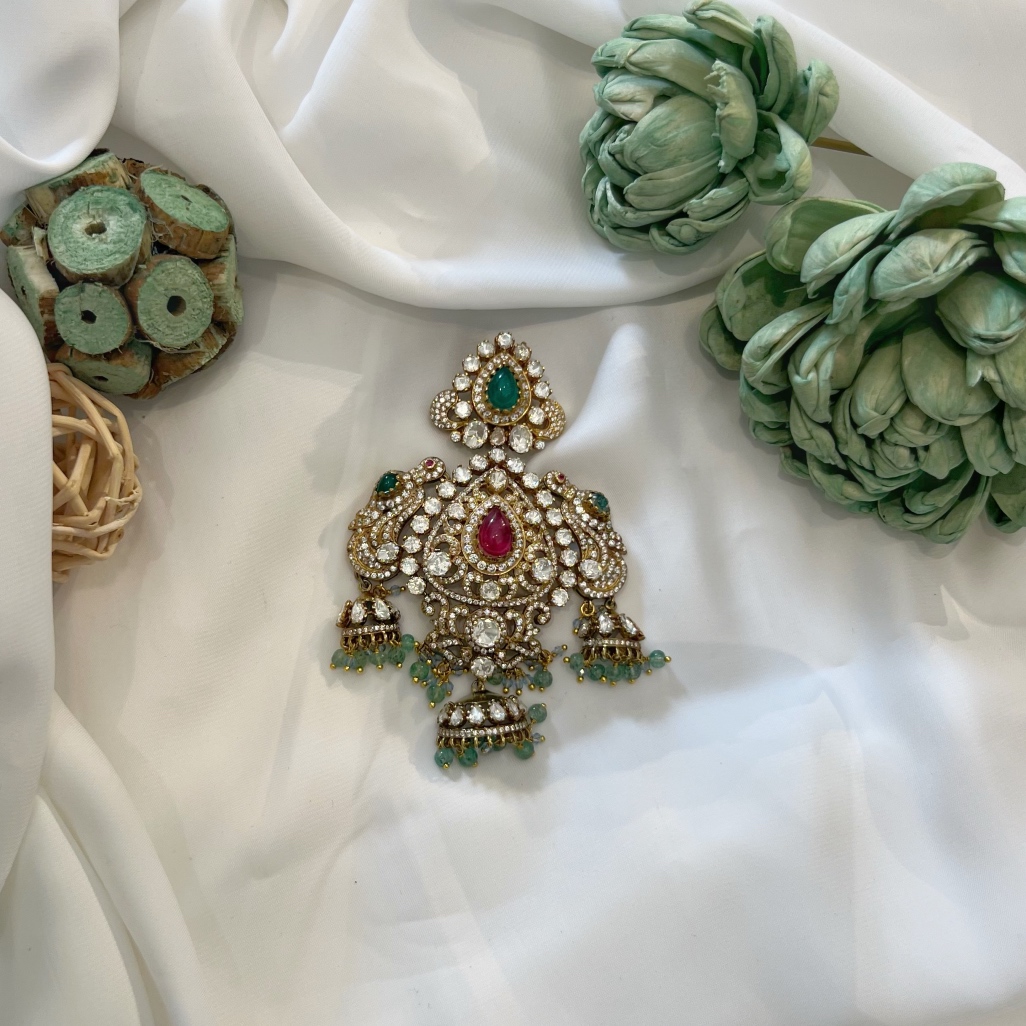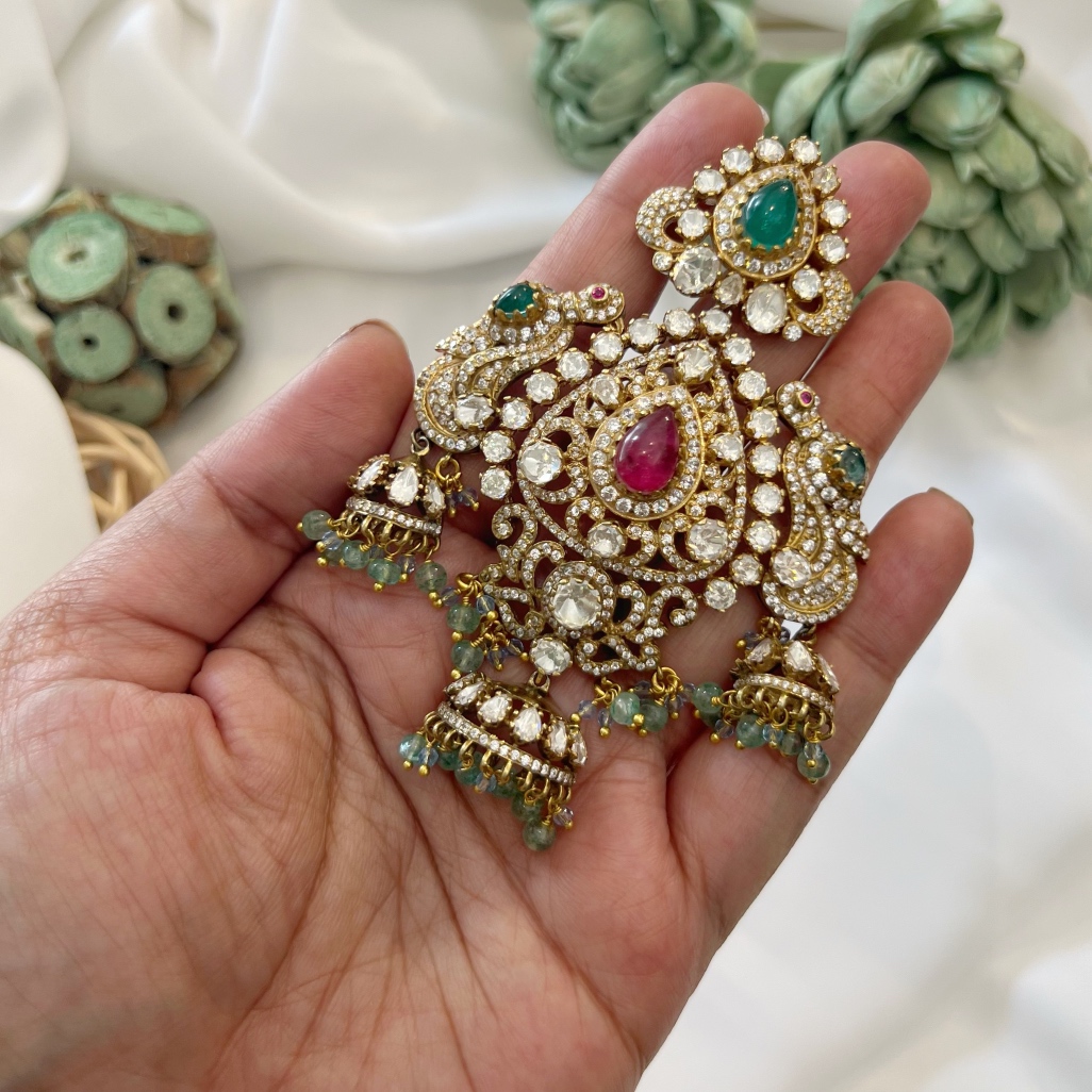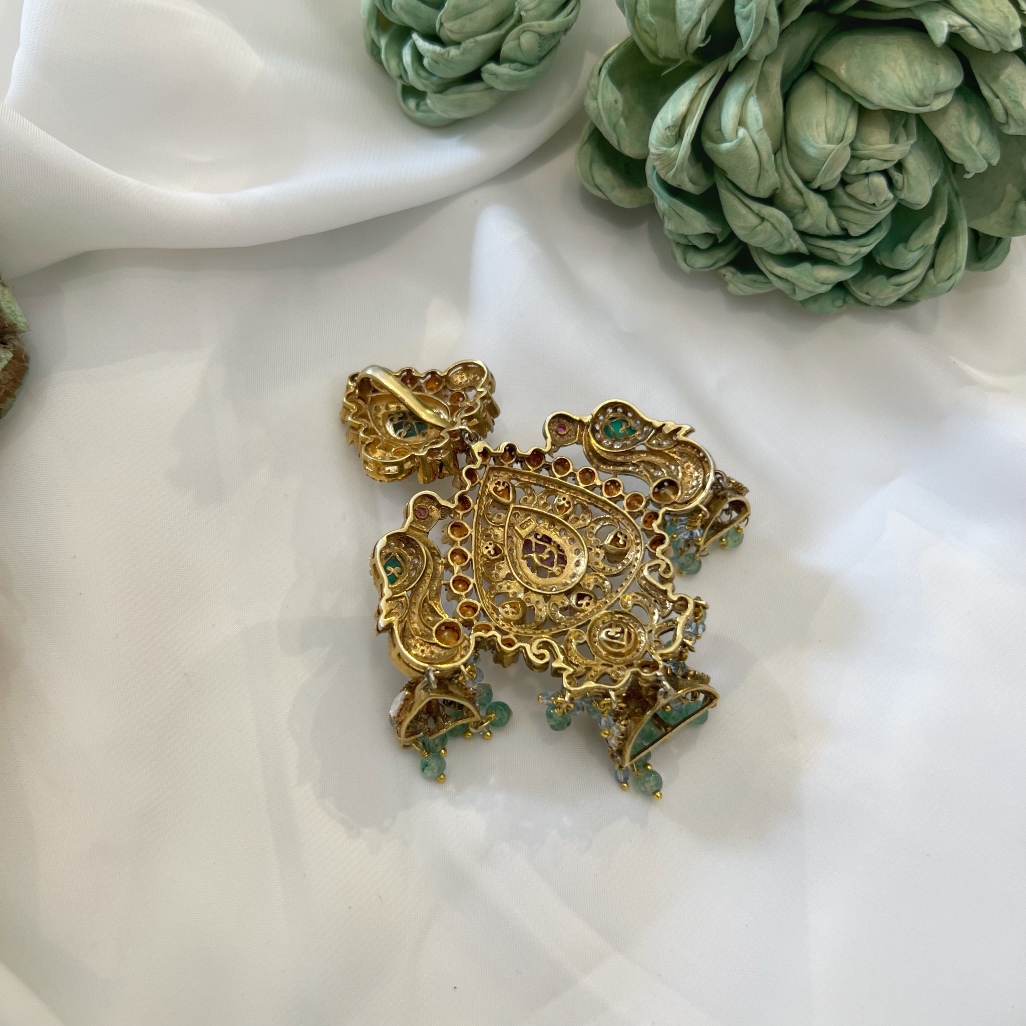 This Victorian Antique Finish Pendant is an exquisite blend of timeless artistry and luxurious design. Handcrafted in 92.5 sterling silver with 22kt gold plating, it features Moissanite Polki, sparkling CZ stones, and rich red & green doublet stones, beautifully complemented by green and blue quartz beads.