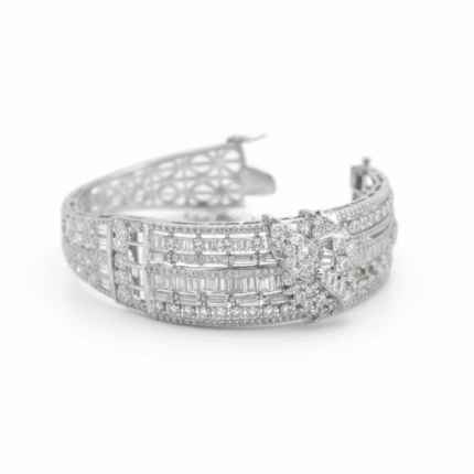 The white/rhodium plating enhances its radiant shine, while the embellished finish adds sophistication to any outfit. Designed with a secure lock, it measures 5.2 cm in length, 2.8 cm in width, and weighs 27 g, ensuring a comfortable and secure fit for size 2.4 wrists.